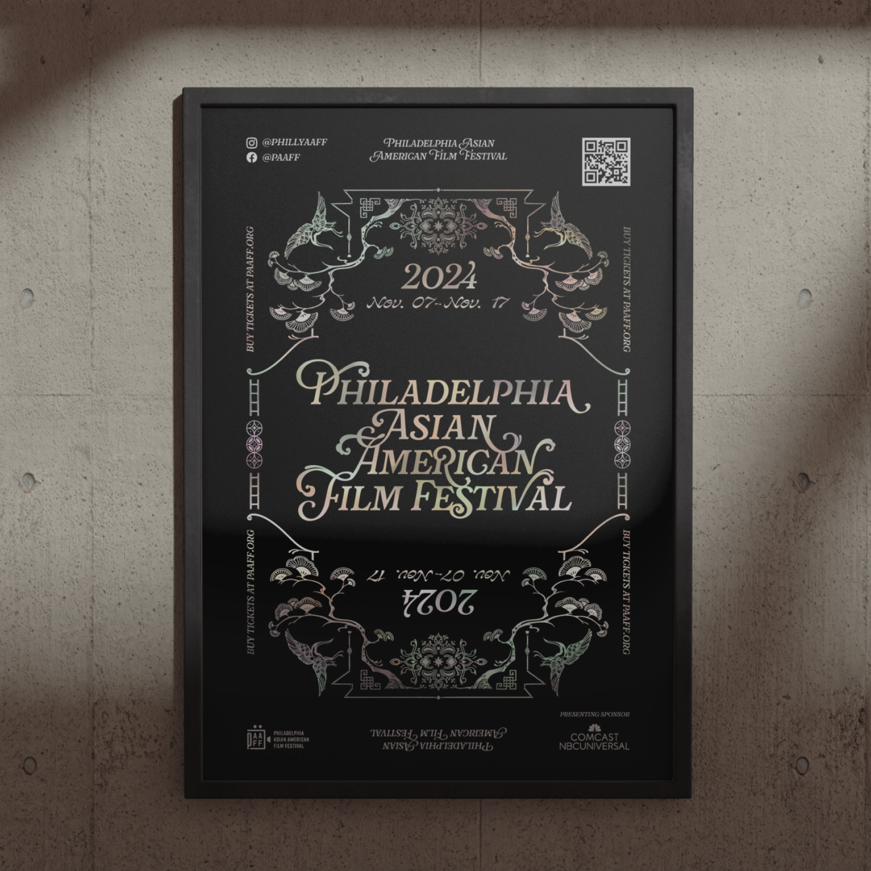 Drawing from illustrative ornaments that combine East Asian motifs, batik patterns, and even the Philadelphia’s Friendship Arch—and emphasizing balance and symmetry through framing—the PAAFF design team built a cohesive visual world, translating Mother-of-Pearl into screen and print.